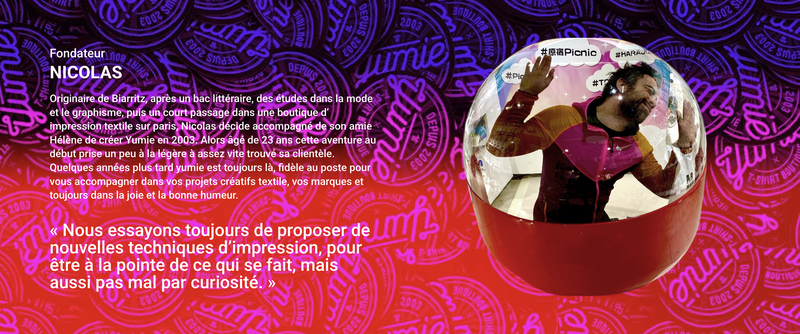 Yumie est une entreprise fondée en 2003, spécialisée dans l’imprimerie textile et la création graphique personnalisée. Elle est située à Bordeaux.
